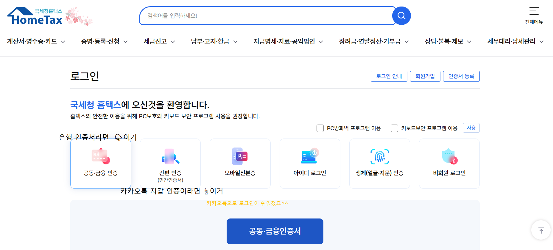 - 본인 인증 수단: 공동인증서(구 공인인증서) 또는 금융인증서